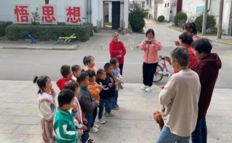 幼儿园小朋友在村委门口开展“我为奶奶唱首歌 ”活动
